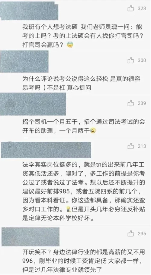 法学也是公务员岗位招聘最多的专业之一,在考公务员时,是有一定的优势的。但全国开设法学专业的高校太多,毕业生也很多。就导致毕业生就业质量高低不一,悬殊很大。有人年薪百万,有人月薪三五千。学生们的讨论也很有意思: