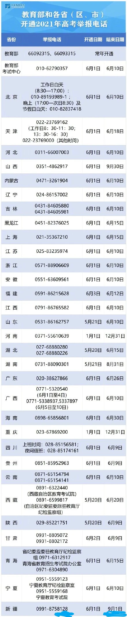 近日,教育部统一公布2021年高考举报电话,欢迎考生、家长及社会各界及时举报反映涉及2021年高考的问题线索。教育部及各省区市将会同有关部门,根据举报线索第一时间核查处理,坚决维护高考公平公正。