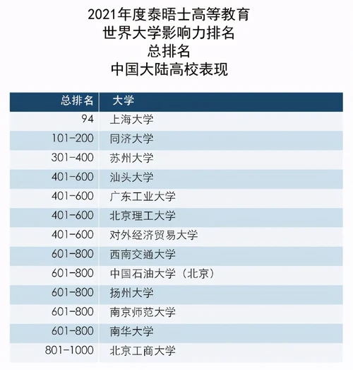 上海大学首次参加影响力排名,总排名位列世界第94名,是总排名中排名最高的中国大陆高校。上海大学今年首次参加影响力排名,并且是总排名前100名中唯一的中国大陆高校代表。上海大学在SDG 6、8、9和16的单项排名中位列世界前100名。6所中国大陆高校在世界总排名中首次入榜。