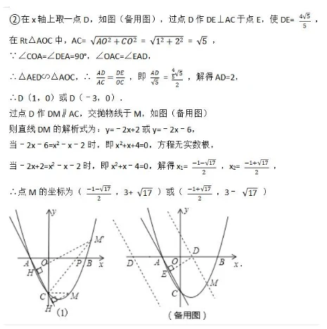 ②在x轴上取一点D,过点D作DE⊥AC于点E,可以证明△AED和△AOC相似,根据相似三角形对应边成比例列式求解即可得到AD的长度,然后分点D在点A的左边与右边两种情况求出OD的长度,从而得到点D的坐标,再作直线DM∥AC,然后求出直线DM的解析式,与抛物线解析式联立求解即可得到点M的坐标.