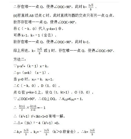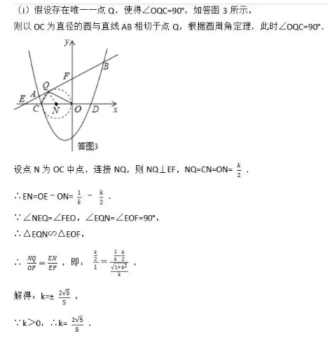 (3)“存在唯一一点Q,使得∠OQC=90°”的含义是,以OC为直径的圆与直线AB相切于点Q,由圆周角定理可知,此时∠OQC=90°且点Q为唯一.以此为基础,构造相似三角形,利用比例式列出方程,求得k的值.需要另外注意一点是考虑直线AB是否与抛物线交于C点,此时亦存在唯一一点Q,使得∠OQC=90°.