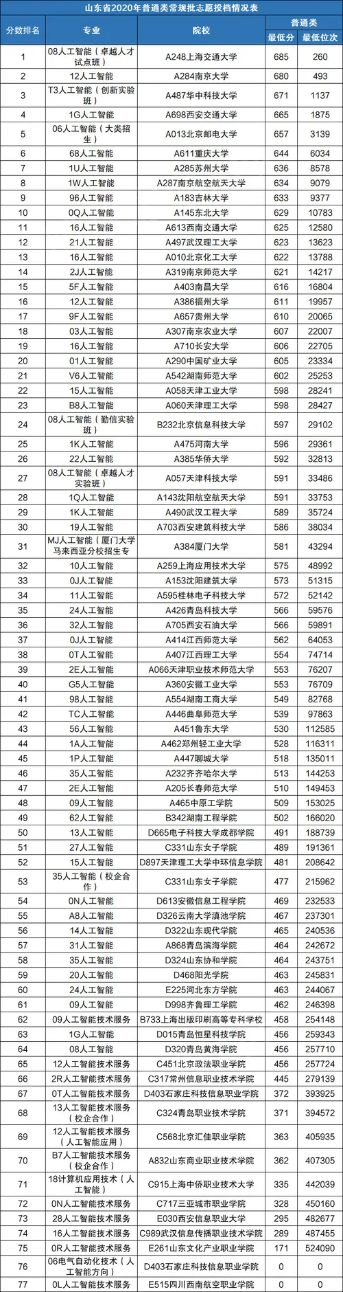 同时本文整理全国开设人工智能专业的大学,2020年在山东省的分数排名情况,以供各位考生和家长综合参考。