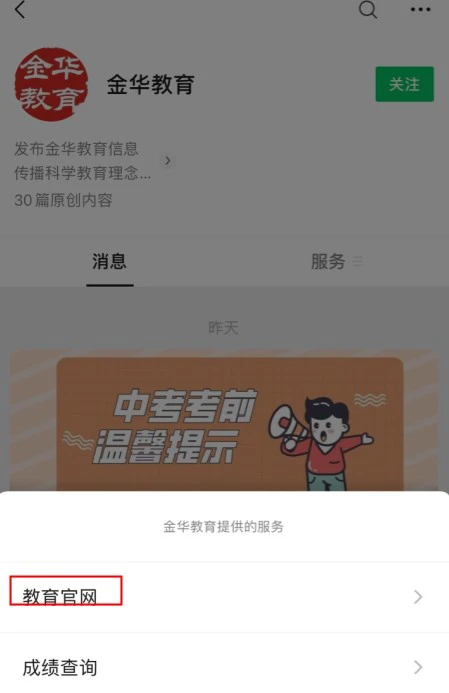 关注金华教育微信公众号,点击右下角服务,成绩查询。