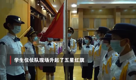 龙院士进场时,学生们送上了将近一分钟的热烈掌声。 随后,校方在礼堂内举办了简朴隆重的欢迎仪式,学生仪仗队现场升起了五星红旗。
