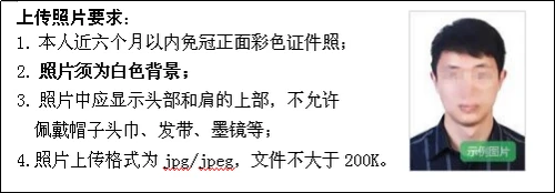 2.上传照片:照片将用于准考证以及考试合格证明,请考生上传照片时慎重选用。照片不合格的考生审核将不能通过。