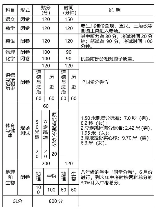 2021年中考考试科目涵盖国家《义务教育课程设置实验方案》规定的11个科目。其中,九年级考试科目为:语文、数学、英语(含听力)、物理(含物理实验)、化学(含化学实验)、道德与法治、历史、体育与健康。八年级考试科目为:地理、生物(含生物实验)、信息技术。