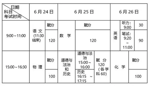 2021年全市九年级中考笔试时间定为6月24日至26日。考试科目为语文、数学、英语、物理、化学、道德与法治和历史。具体安排如下: