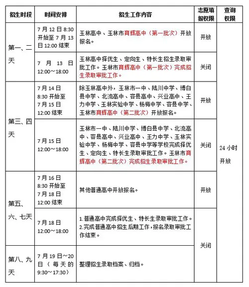 今年普通高中招生在7月12日至20日内进行。志愿填报平台通过互联网进入玉林市教育局网站登录,玉林市教育局网站网址:http://edu.yulin.gov.cn。具体时间安排如下: