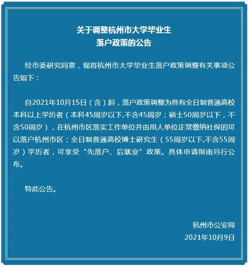 自2021年10月15日(含)起,落户政策调整为具有全日制普通高校本科以上学历者(本科45周岁以下,不含45周岁;硕士50周岁以下,不含50周岁),在杭州市区落实工作单位并由用人单位正常缴纳社保的可以落户杭州市区;
