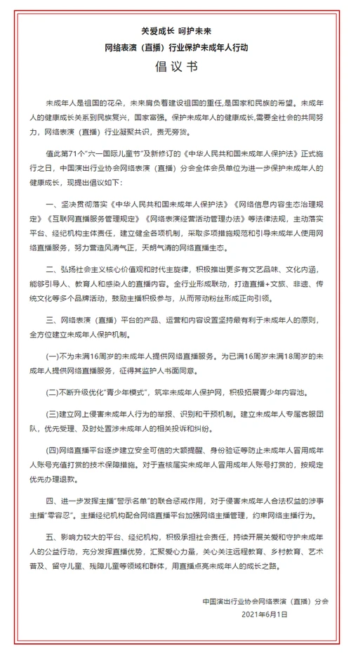 中国演出行业协会网络表演(直播)分会全体会员单位为进一步保护未成年人的健康成长,提出倡议如下: