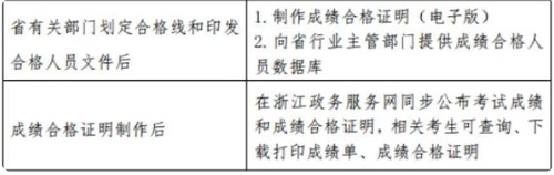 考试成绩经省考试与行业主管部门核定合格线,并下发合格人员文件后,制作电子成绩合格证明。考试成绩和成绩合格证明一并在浙江政务服务网(http://www.zjzwfw.gov.cn)上公布。届时,相关考生可上网查询、打印考试成绩和成绩合格证明。