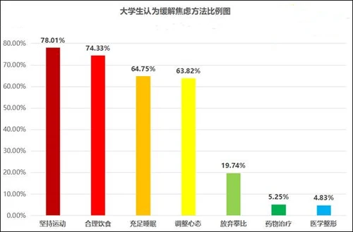 记者通过调查发现,和陈冕一样存在身材焦虑并通过运动做出改变的大学生不在少数。数据显示,85.82%的大学生会为自己的身材做出改变,68.1%通过运动减肥做出改变,其次是制定计划、节食和健身房锻炼,分别占比60.47%、33.79%、24.25%。对于如何缓解身材焦虑这一问题,78.01%大学生认为应该坚持运动,其次是认为合理饮食、充足睡眠和调整心态,分别占比74.33%、64.75%、63.82%。