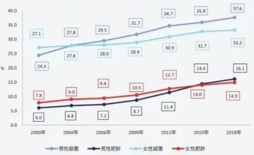 根据中国营养学会发布的《中国居民膳食指南科学研究报告(2021)》显示,我国约50%的成年人和20%的儿童超重肥胖。且2000-2018年不同性别的人群超重率和肥胖率整体呈现上涨的趋势。