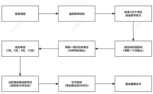 报名考证流程:咨询机构→填报信息→报名缴费→备考(课程+题库+教材)→考试通知→正式报考→打印准考证→考试拿证!