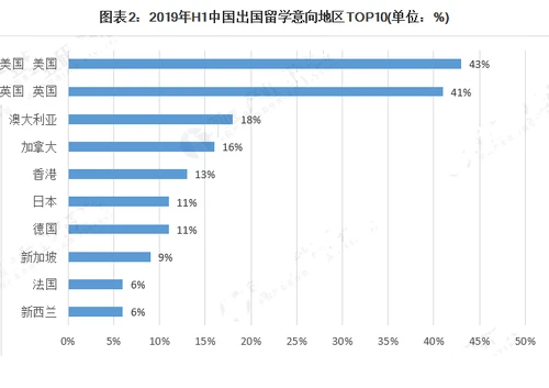 2019年上半年我国留学人群中留学意向最高的是美国,其次是英国、澳大利亚、加拿大、香港、日本和德国,美国和英国留学意向遥遥领先,留学意向分别为43%、41%。