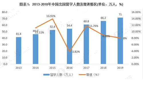 前瞻产业研究院数据显示:2013-2018年,我国出国留学人数逐年增长,增速波动较大。2018年我国出国留学人数为66.2万人,同比增长8.88%。其中,国家公派3.02万人,单位公派3.56万人,自费留学59.63万人。初步估计2019年留学人数在71万左右。