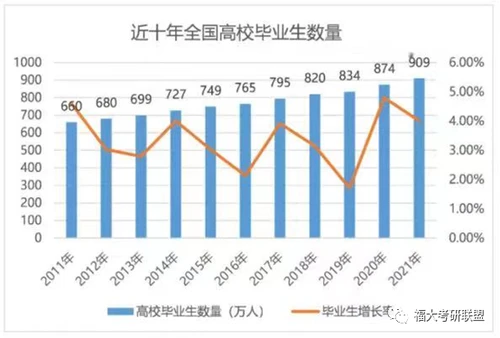 就业压力,是导致研究生报名人数暴涨的主要原因之一。2021届高校毕业生规模预计达909万人,同比增加35万人,近十年来高居不下。加上新冠疫情的影响,使得就业形势更为严峻。