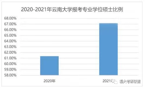 2020年,云南大学考研报考专业学位硕士人数为13418人,占比61%;而在2021年,考研报考专业学位硕士人数为16557人,占比67%,占比增长了6%。