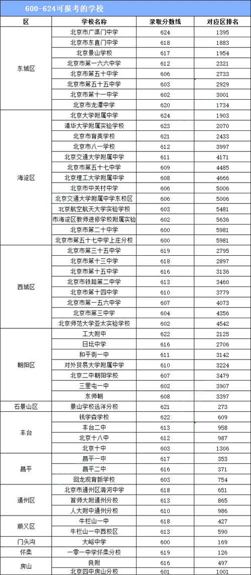 2、从上图中可以看出,录取分数线在600-624之间的学校,不仅仅集中在东西海朝的学校,基本上各个区都有几所学校上榜!