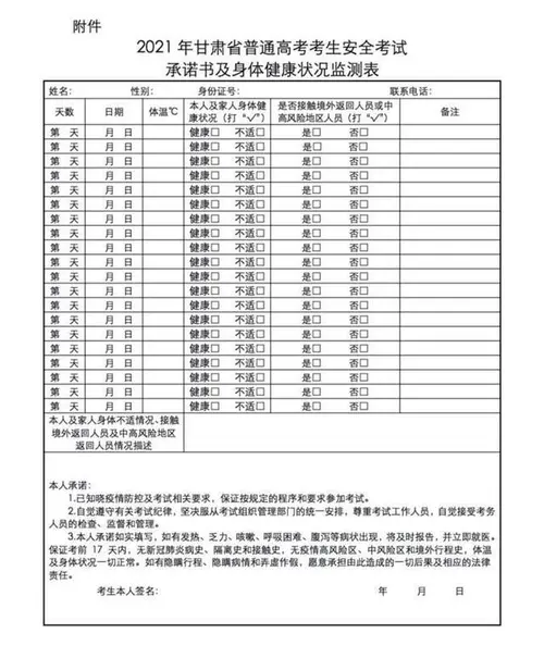 考前17天,考生和涉考人员原则上不得离开甘肃,并做好健康监测。各地实行“日报告、零报告,并签订《2021年甘肃省普通高考考生安全考试承诺书及身体健康状况监测表》,考前3天方可发放准考证和工作证。参与考试工作人员原则上应全员接种新冠疫苗。