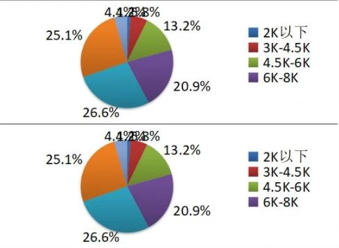 8000-10000元的月薪占比最大,拥有26.6%的比重;1万-1.5万,占比25.1%。