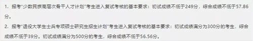 1.报考“对口支援西部地区高校定向培养研究生计划”考生进入复试的初试成绩基本要求:总分不低于260分。