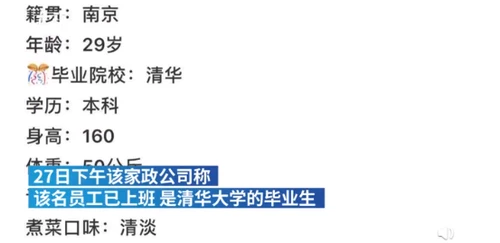 日前,上海一家政公司在某社交网络平台上,发布了一则清华毕业生求职家政“管家”的消息,引发广泛关注。5月27日,该家政公司工作人员向南都记者表示,求职消息中的学历信息属实,“我们有很多像清华、利物浦大学的高端人才。”