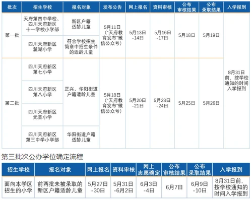 第一批次:新区民办小学面向区内专项招生(具体招生报名公告请关注“天府教育发布”微信公众号)。
