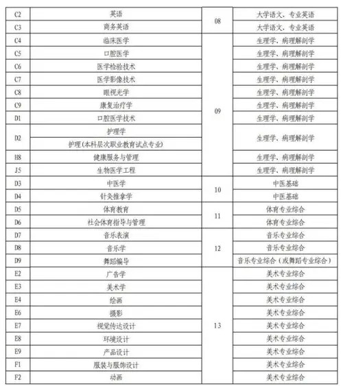 体育、音乐、舞蹈、美术专业考生文化科目考试只考英语(专业综合为各类的专业考试)。