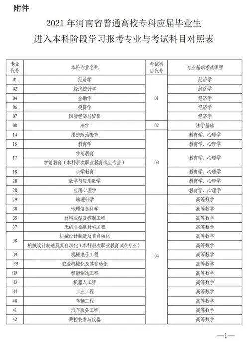 附件:2021年河南省普通高校专科应届毕业生进入本科阶段学习报考专业与考试科目对照表