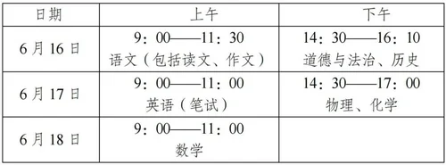 文化科目考试日期定于6月16日、17日、18日三天。考试用时:语文150分钟,数学120分钟,英语120分钟,物理和化学150分钟,道德与法治和历史100分钟。