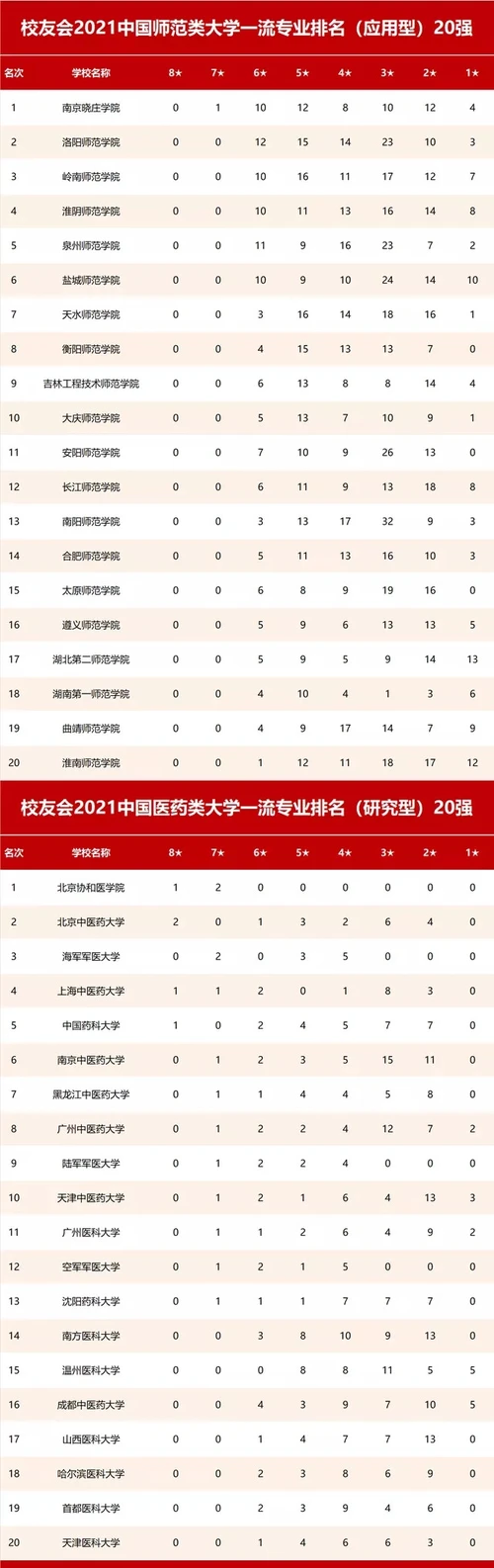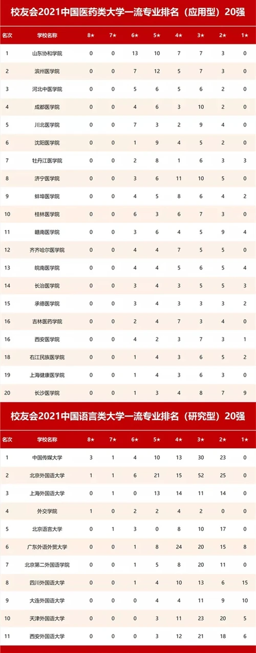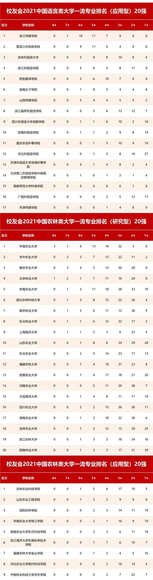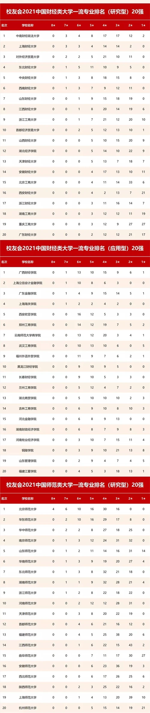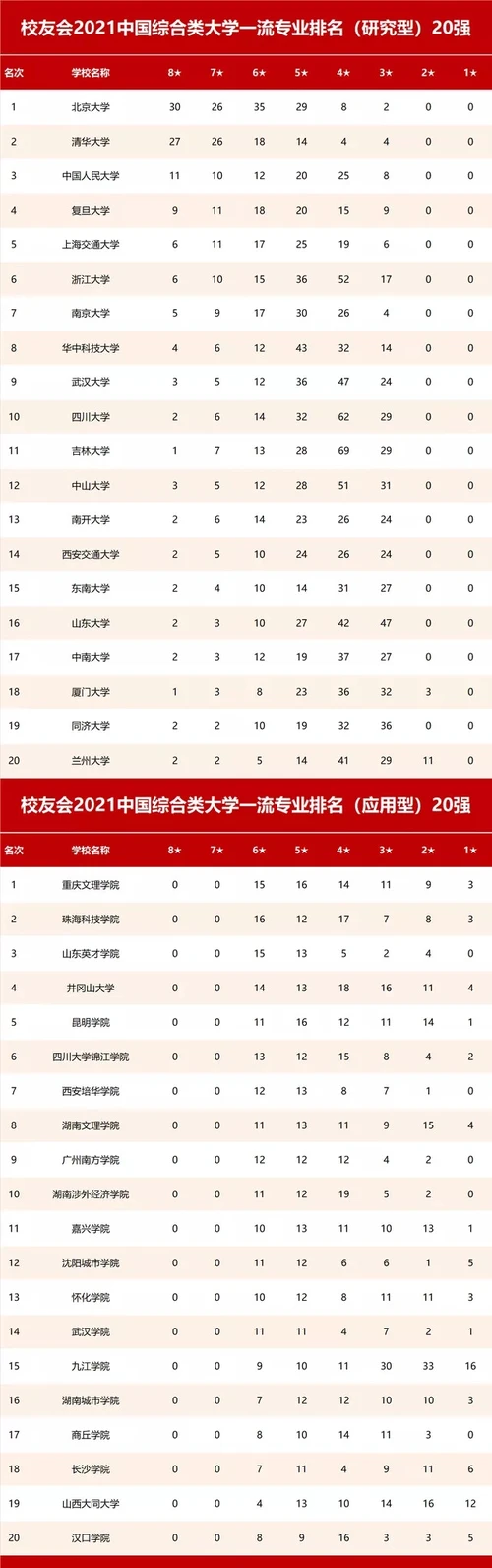 在最新2021校友会中国各类型大学一流专业排名中,北京大学、中南财经政法大学、北京师范大学、中国科学技术大学、中国农业大学、中国传媒大学、中央美术学院、北京协和医学院、中央民族大学、北京体育大学、中国政法大学分列2021中国综合类、财经类、师范类、理工类、农林类、语言类、艺术类、医药类、民族类、体育类、政法类大学一流专业排名(研究型)第一。