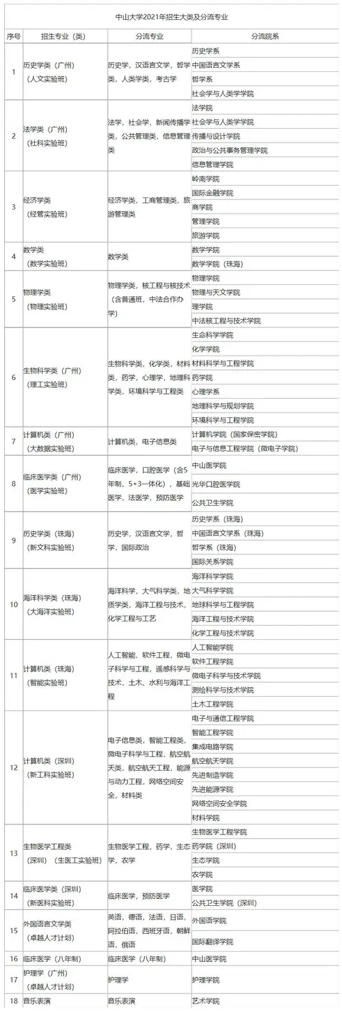 今年,中山大学按历史学类、法学类、经济学类、数学类、物理学类、生物科学类、计算机类、临床医学类、海洋科学类、生物医学工程类、外国语言文学类、临床医学(八年制)、护理学、音乐表演等招生专业(类)进行招生。