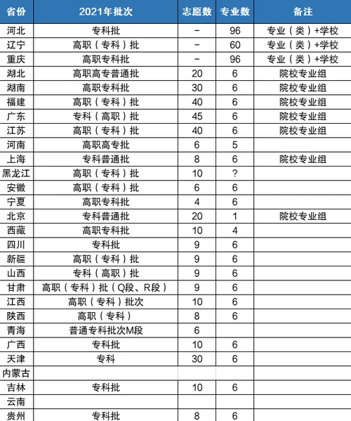 根据上表的各省市大专志愿数量汇总可知(山东、浙江没有专科批,只有平行二段录取),在以院校为志愿填报单位的地区中,以黑龙江、广西、西藏、江西、吉林这几个地方的数量为最多,均为10个院校志愿。这就意味着在这些地区中大专最多可以报10所学校。