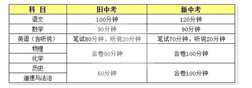语文和物化总分各自增加20分,由100分变为120分,为语文及物化学科好的学生提供了更多机会;英语听说由15分增加至25分,笔试变为75分,新中考英语开始更加注重语言的实践与运用;历史由原来的30分调整为70分,可以看出,新中考在素质教育这一块有所偏重,加强了学生在人文学科方面的考察。