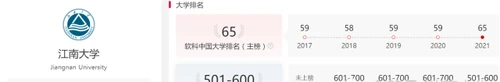 软科中国大学排名自2015年首次发布以来,江南大学一直排名50多名。2021年,江南大学软科排名第65名,首次排名超出60名。