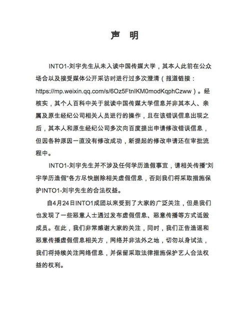 新京报讯 4月30日,INTO1组合官博发表声明,针对INTO1组合成员刘宇学历一事进行澄清。声明中表示,刘宇从未入读中国传媒大学,其本人此前在公众场合以及接受媒体公开采访时进行过多次澄清。