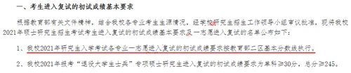 我校2021年研究生入学考试各专业一志愿进入复试的初试成绩要求按教育部二区基本分数线执行。