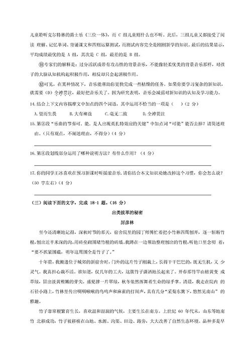 题目:17.你的同学王冰喜欢在预习新课时听摇滚音乐,请你结合本文知识劝她改掉这个习惯,你会怎么说?