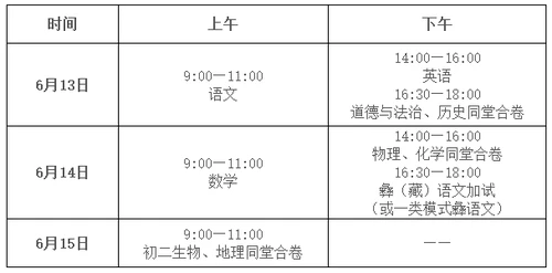 中考考试科目为:语文、数学、英语(含听力)、物理、化学、道德与法治、历史、体育、理科实验操作(物理、化学)、彝(藏)语文加试(二类模式考生参加)、一类模式彝语文(一类模式考生参加);初二学业水平考试科目为:生物、地理。