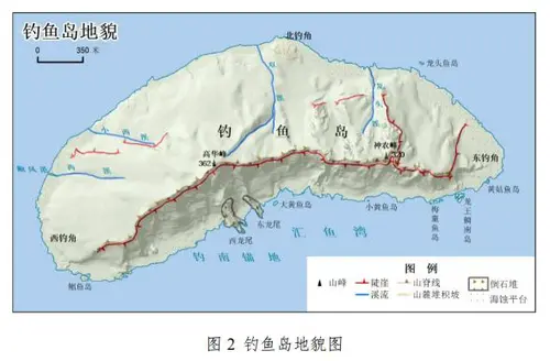钓鱼岛属于侵蚀剥蚀低山丘陵,地形陡峭,中央山脉山脊线呈东西走向,连接主峰高华峰(海拔362米)和神农峰(海拔320米),位于岛屿中南部,形成了北坡稍缓、南坡陡峭的地形格局。图1和图2分别为钓鱼岛遥感影像图和地貌图。钓鱼岛近岸有较为宽阔的浅海区域,尤其是东钓角附近,有宽广的水下浅滩发育,并与飞屿周边浅滩相连接。图3为钓鱼岛近岸30米以浅区域的地形图。