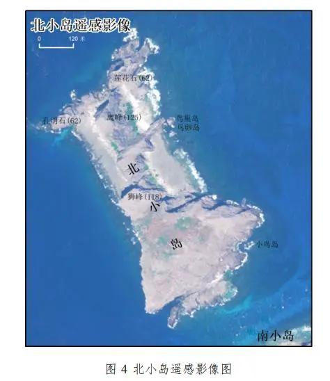 北小岛属侵蚀剥蚀丘陵地貌,地形起伏较大,海岸类型为基岩海岸,海蚀作用强烈,发育有海蚀崖、海蚀平台、海蚀柱等海蚀地貌。北小岛东南部的狮峰(118米)与其西北的鹰峰(125米)、莲花石(62米)和孔明石(62米)等三个独立尖岩,经海蚀平台连成一体。图4、图5和图6分别为北小岛遥感影像图、地貌图和现场观测照片。北小岛与南小岛之间的橄榄门水深在10米左右,宽约200米。两岛的近岸浅海区域(30米以浅)连成一片,西南侧狭窄,而其东北侧宽阔延伸近2000米,其间分布了一系列潮沟地形。北小岛西南和东北两侧海岸有大量垂直于海岸的潮沟和礁坪发育。图7为北小岛与南小岛浅海水下地形图。