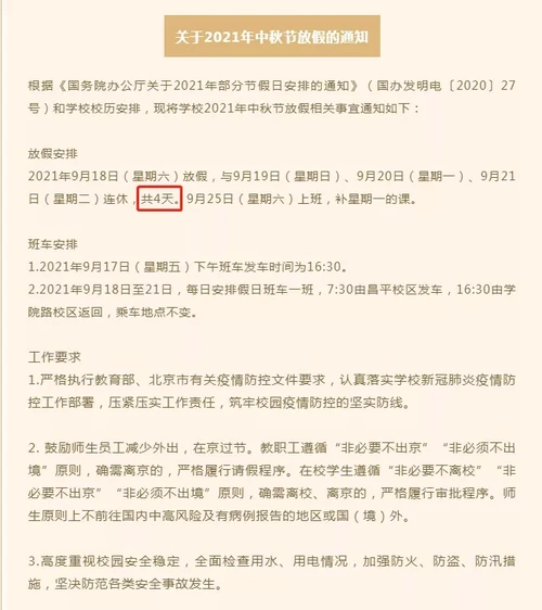 9月16日,法大官微发布的中秋节放假通知也显示,2021年9月18日(星期六)放假,与9月19日(星期日)、9月20日(星期一)、9月21日(星期二)连休,共4天。9月25日(星期六)上班,补星期一的课。
