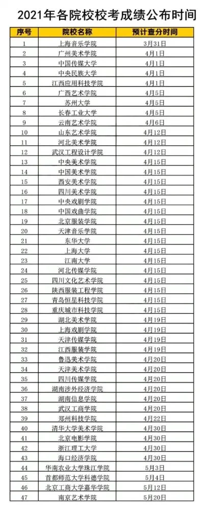 2021校考什么时候出成绩?校考成绩是指某些大学在招收艺术类考生时自己学校的专业考试,一般在过年前后。小编还特意收集了关于2021校考成绩查询时间汇总的相关信息,供各位同学参考借鉴,希望大家考个好成绩。