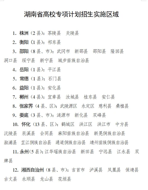 按照国家相关规定,湖南实施高校专项计划的区域为茶陵县等51个县(市、区)。