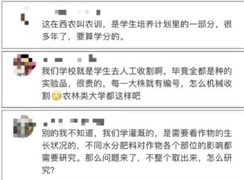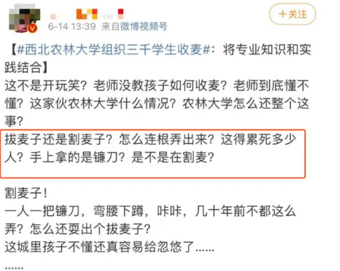 网友在点赞该校理论与实践结合的同时,却有人质疑校方有“作秀”之嫌,并批评部分同学不懂收割常识,将小麦“连根拔起”。