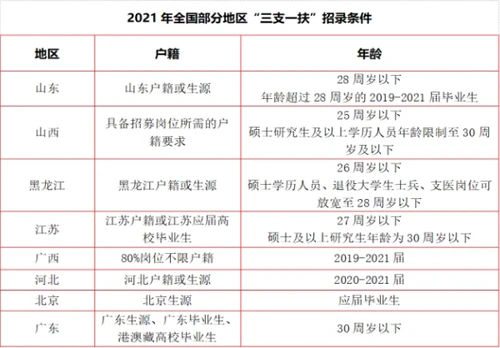 但是不同地区的限制条件也会存在一定差异,下面汇总了部分地区“三支一扶”在户籍以及年龄方面的限制,各位考生可以根据自己所在地区分析自己是否符合报考条件。