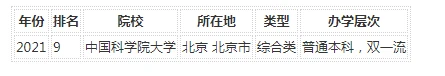 按USNews中国大学排行榜看,中国科学院大学2021年全国排名第9位。