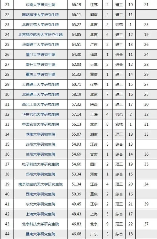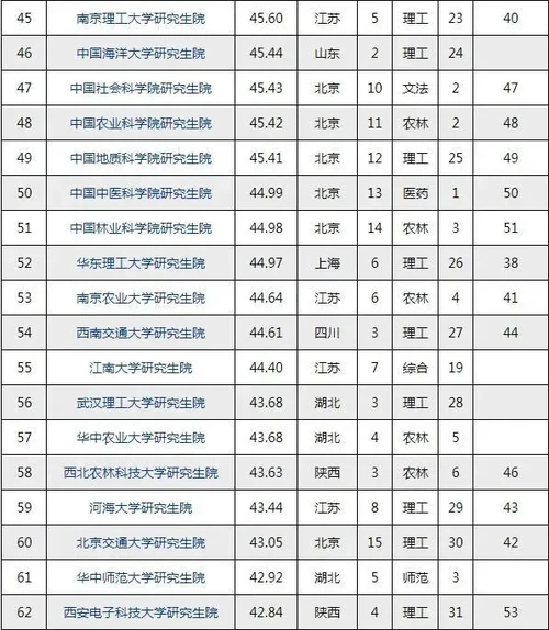 值得注意的是,这份前62名的研究生院的排名,增加了一些科研院所,包括中国社会科学院、中国农业科学院、中国地质科学院、中国中医科学院、中国林业科学院等等,由于这些研究生院的加入,不少大学就显得暗淡无光了,所以排名就要靠后了。对于不想报考科研院所的大学生来讲,那些排名靠后的985大学就显得很重要,属于完全可以报考的对象。