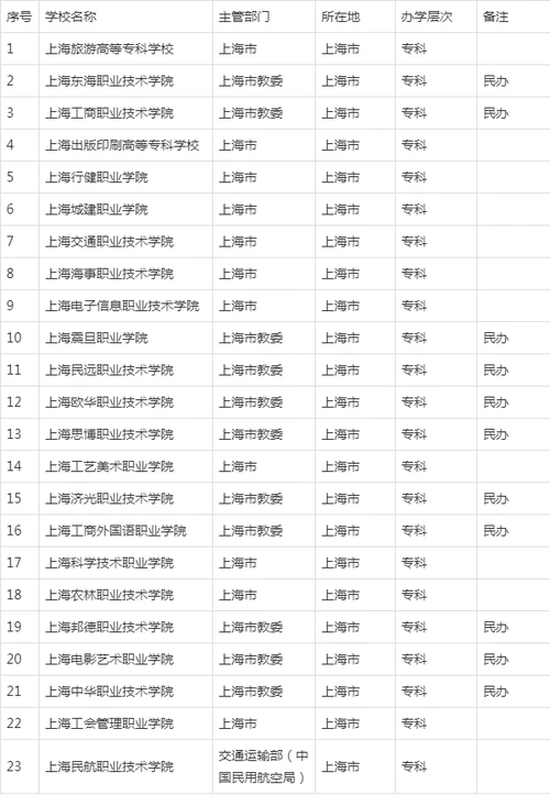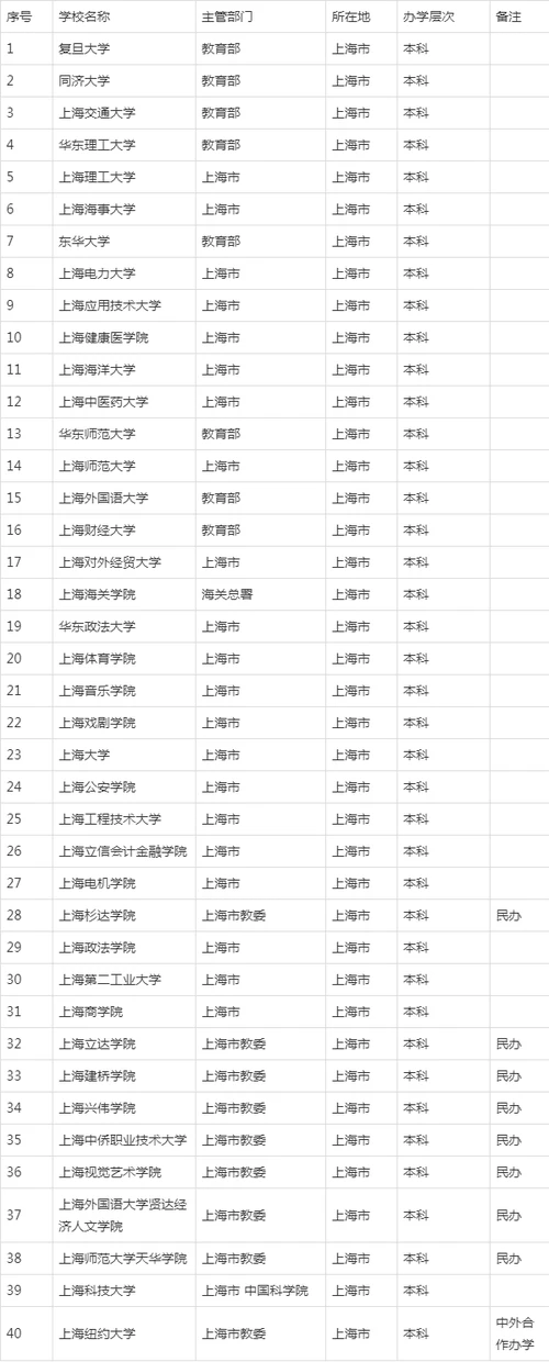 以下是教育部最新公布的上海所有大学名单,共计64所,其中本科学校40所,专科学校23所,备注:民办为民办大学,其他为公办大学。以下数据,不涉及排名。